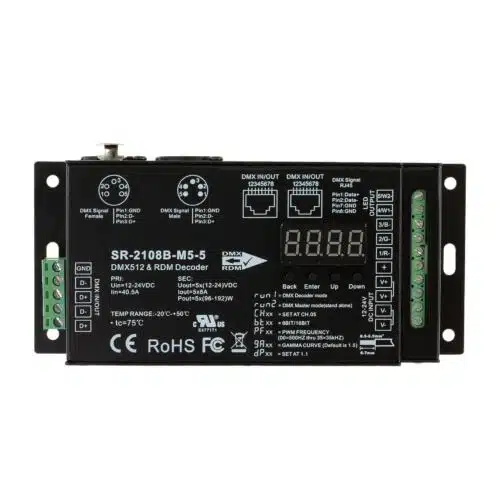 - Data output DMX512-A/RDM (250 Kbps) / DMX500K (500 Kbps) – via 2 x 4-pin Phoenix ports