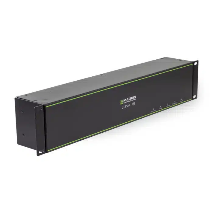 The MADRIX Luna 16 DMX Node is a top-tier Art-Net-to-DMX interface designed for professional, large-scale lighting control. Built for maximum flexibility and performance, the Luna 16 offers 16 DMX universes in a compact rack-mountable design. Whether you’re managing architectural lighting, entertainment venues, or live events, this controller ensures your data flows reliably and in sync—every time.