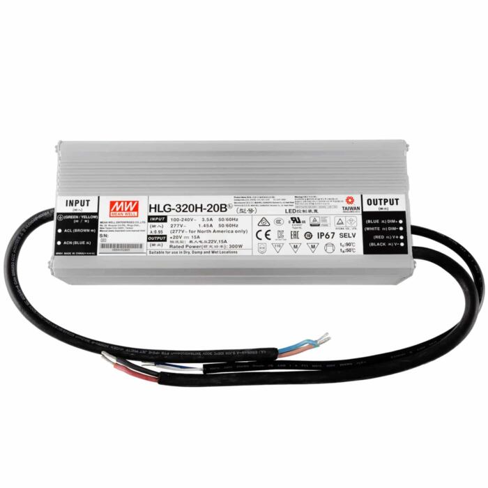 Mean Well HLG-320H-20B 320W 20V DC Switching Power Supply / LED Driver – Dual Mode CV + CC Output, 3 in 1 Dimming Function